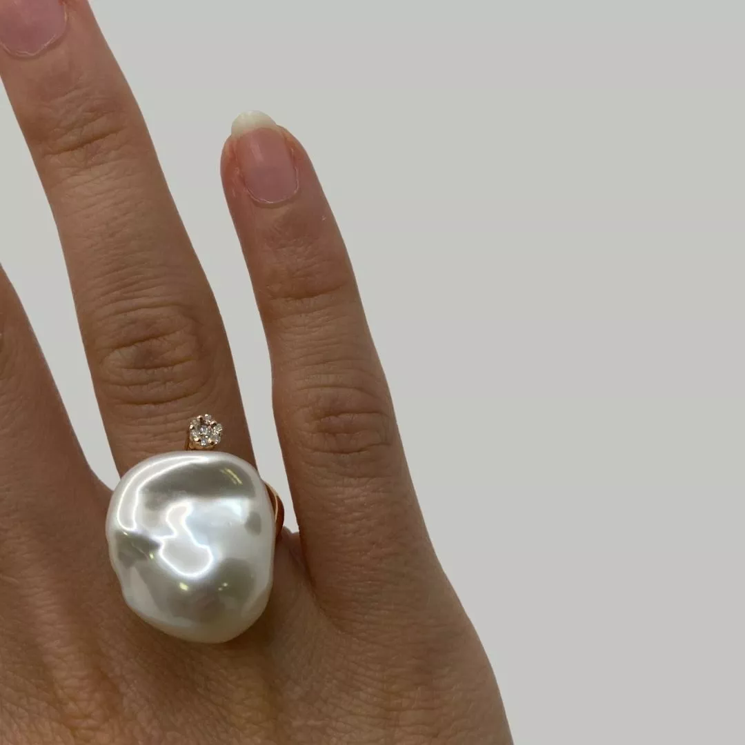 Questo anello è realizzato in oro rosa e presenta una perla freshwater barocca. Viene impreziosito da diamanti.