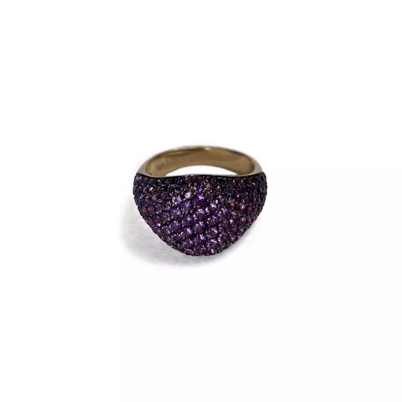 Questo anello Crivelli mignolo è un modello raffinato. L’abbinamento tra oro rosa e pavé di ametiste lo rende ancora più prezioso.