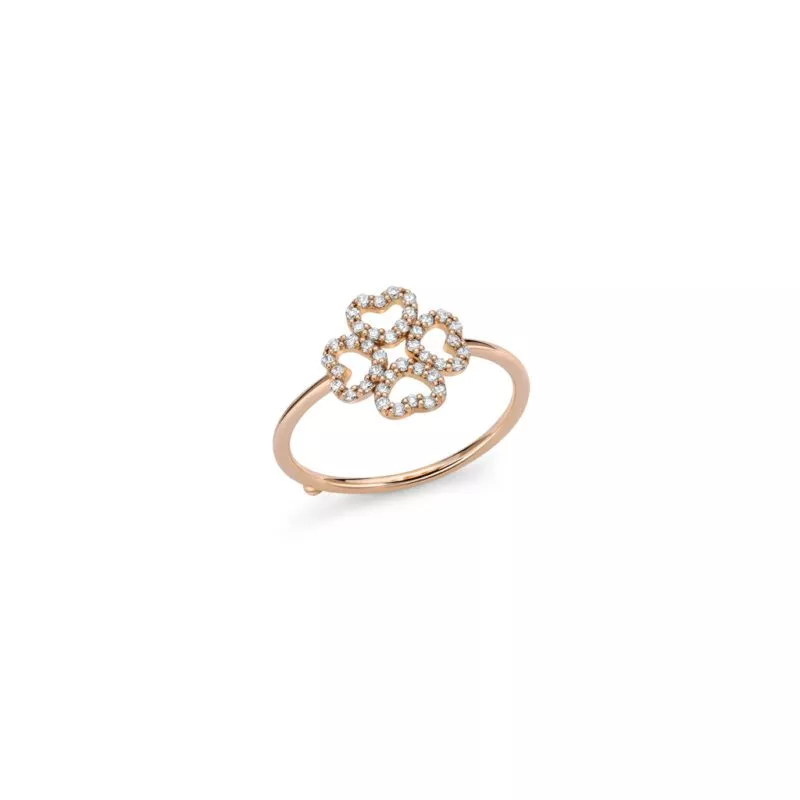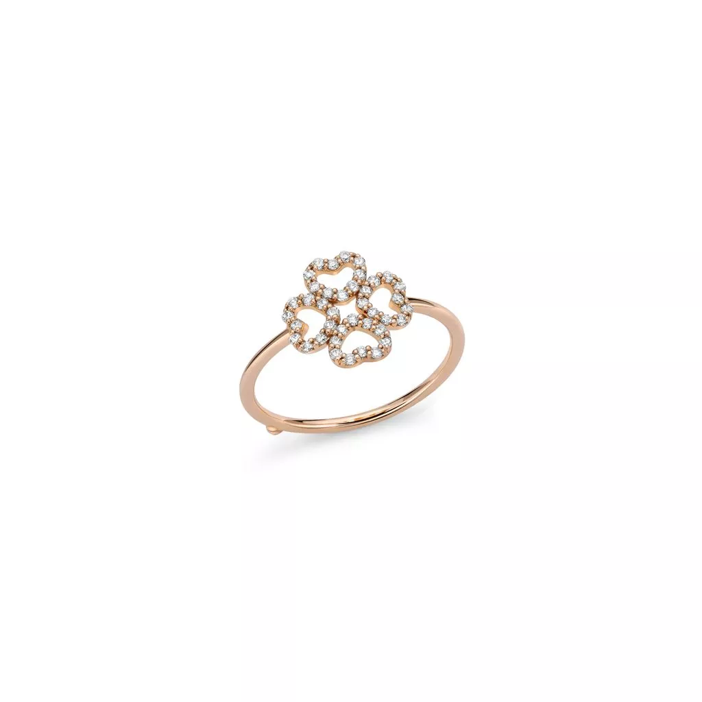 Anello di Marco Gerbella in oro rosa 18K con quadrifoglio a filo e diamanti bianchi.