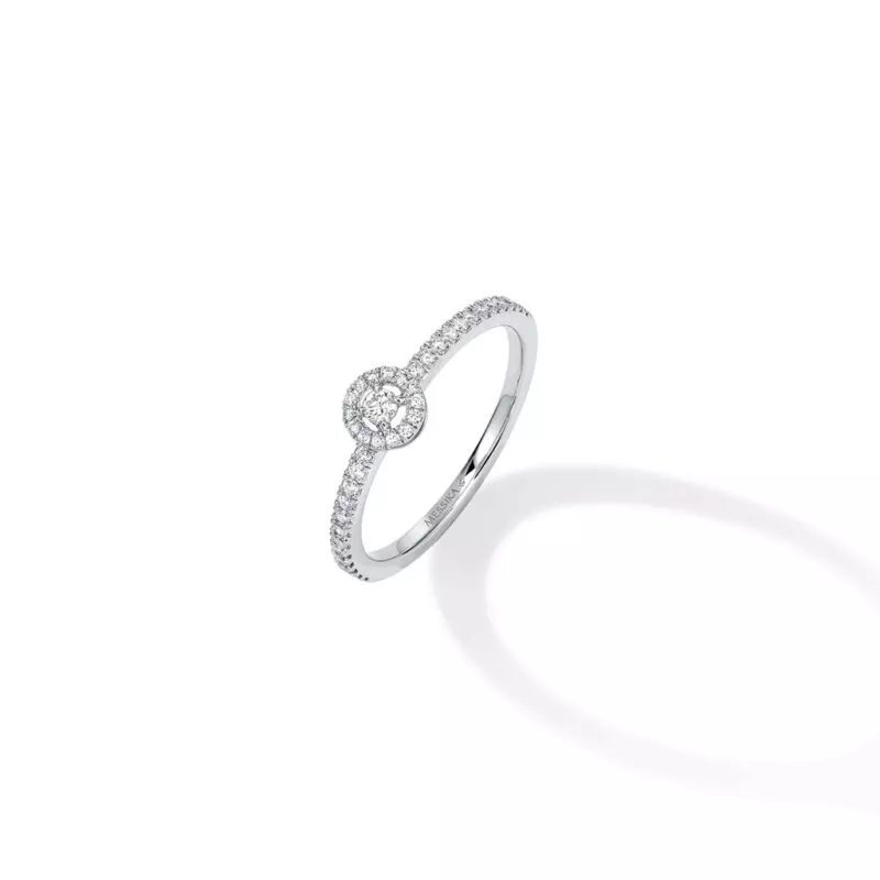 Anello PM della collezione Joy di Messika in oro bianco con diamante centrale, taglio rotondo, impreziosito da un entourage di brillanti.