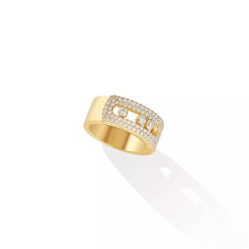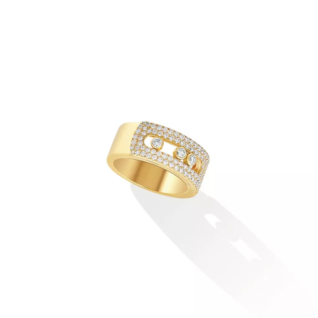 Nella versione grande, la Maison Messika rivisita l’anello Move Noa in oro giallo 18 carati. Un brillante pavé di diamanti bianchi lo illumina.