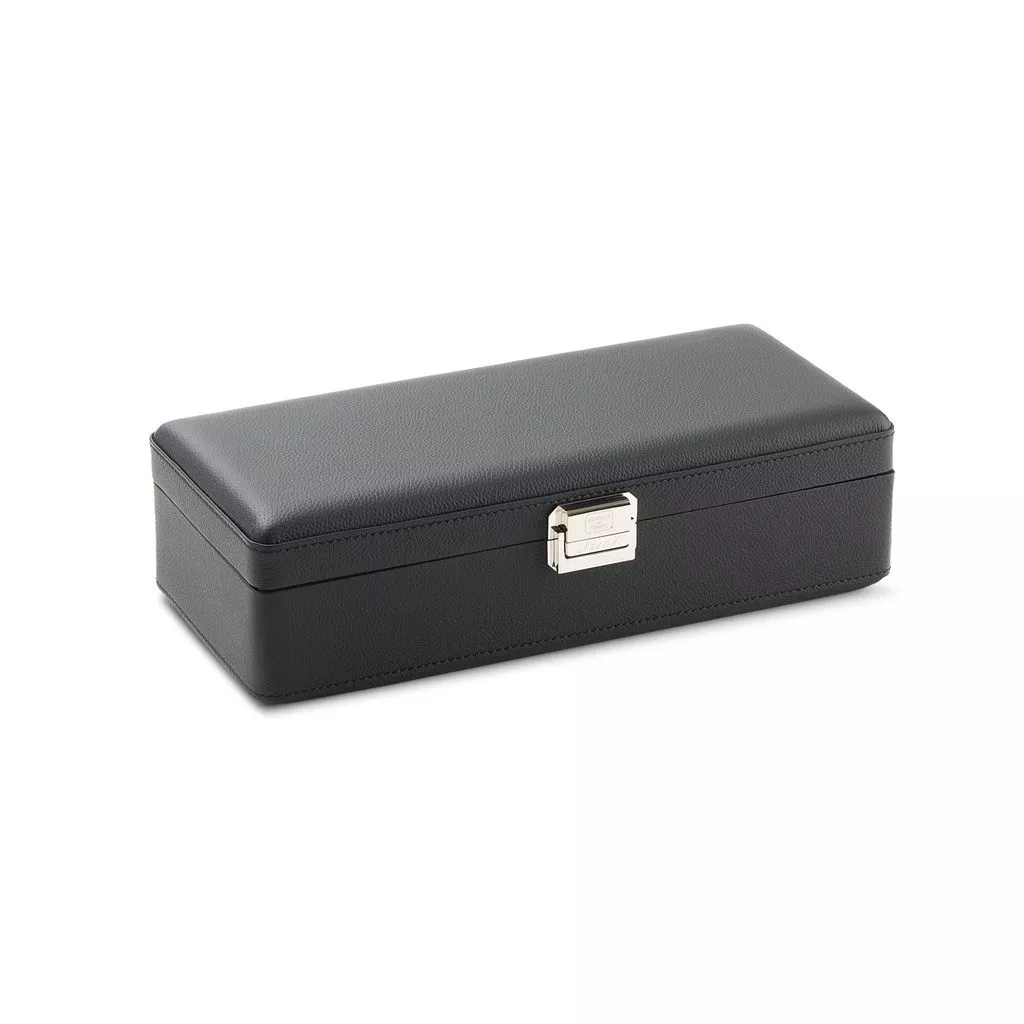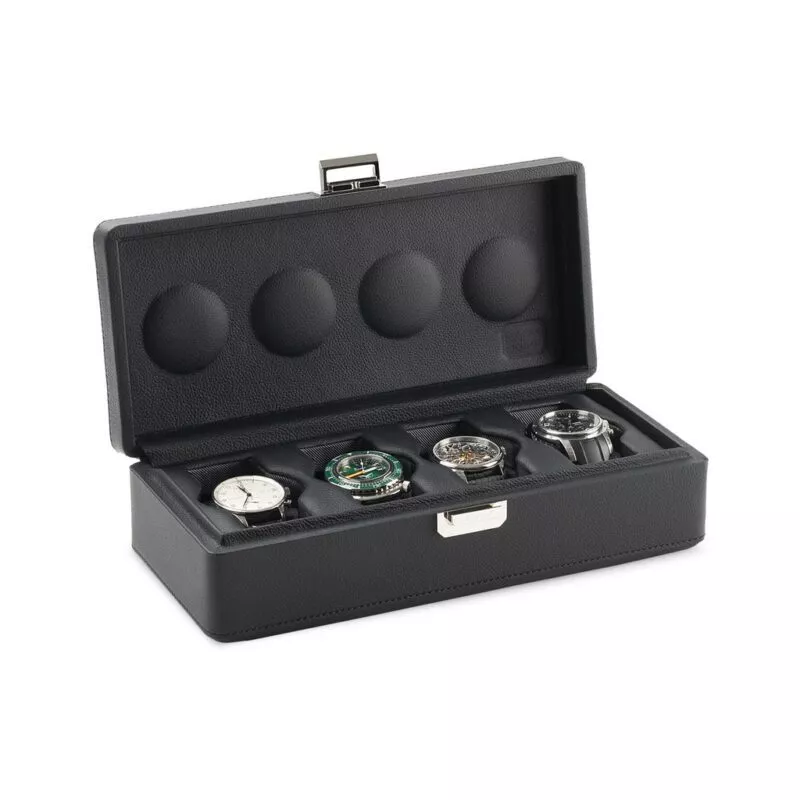 Astuccio per 4 orologi di grandi dimensioni. Rivestito in pelle di vitello nera. Chiusura color argento.