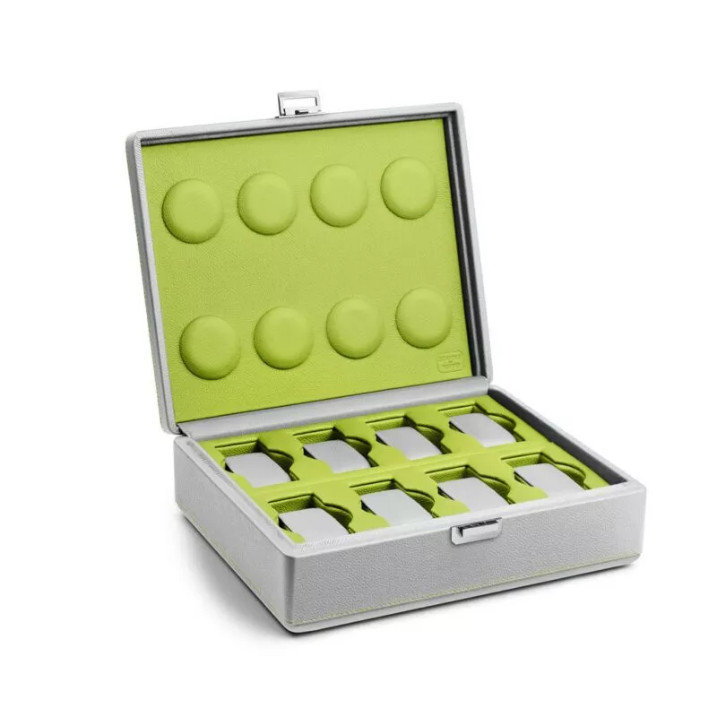 Astuccio per 8 orologi di grandi dimensioni. Rivestito in pelle di vitello grigia e verde. Chiusura color argento.