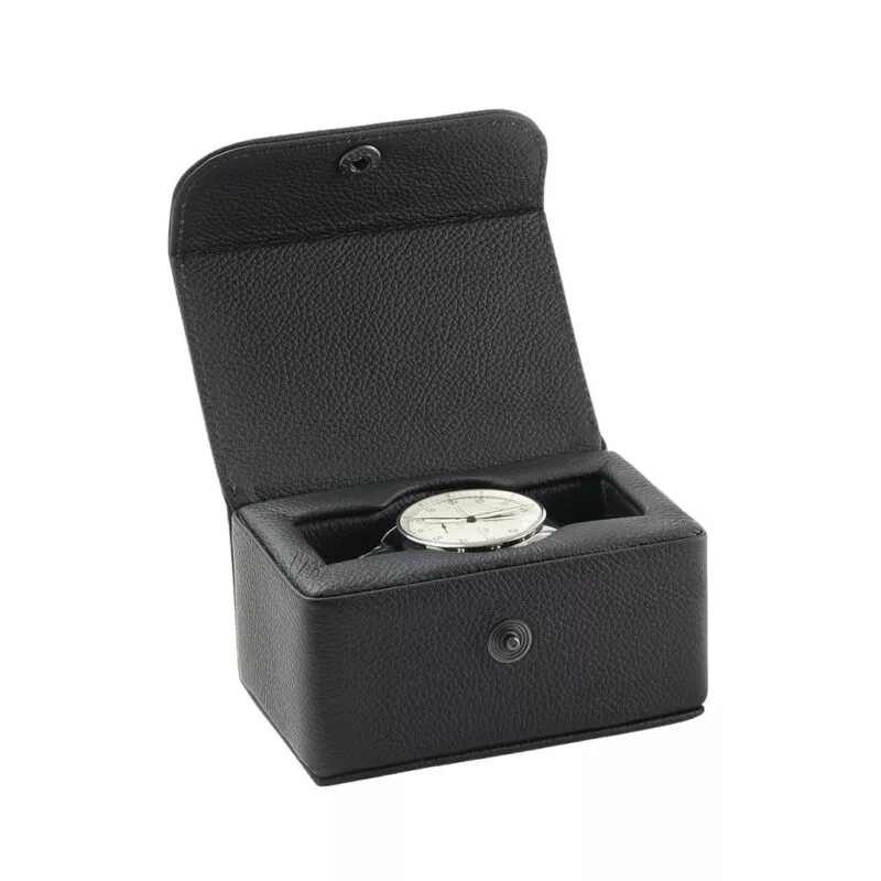 Astuccio per un solo orologio di grandi dimensioni. Rivestito in pelle di vitello nera.