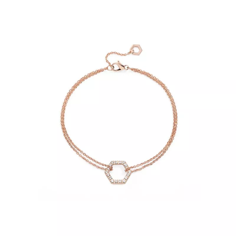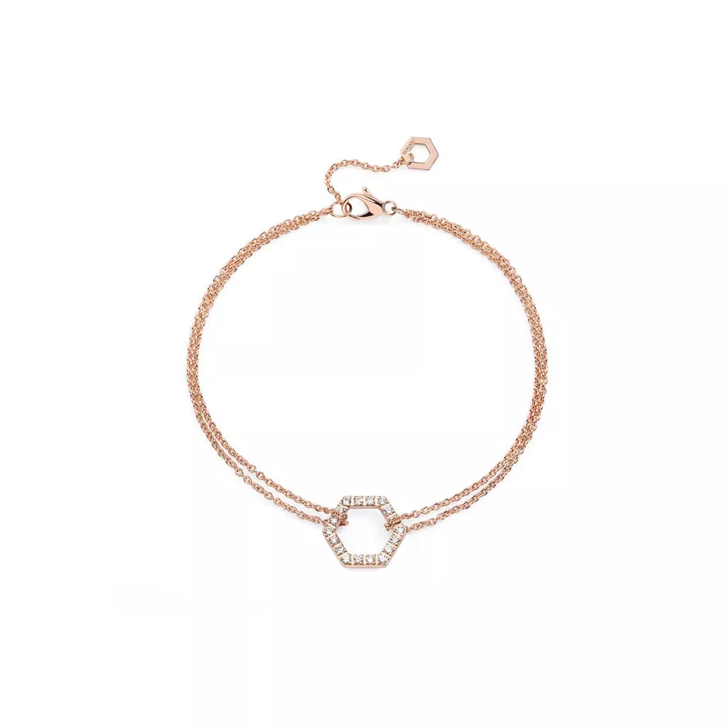 Il bracciale Amuleto Full Diamonds Pink S di Burato è realizzato in oro rosa 18 carati, con scintillanti diamanti bianchi a illuminare il suo raffinato esagono, simbolo di vita e fortuna.