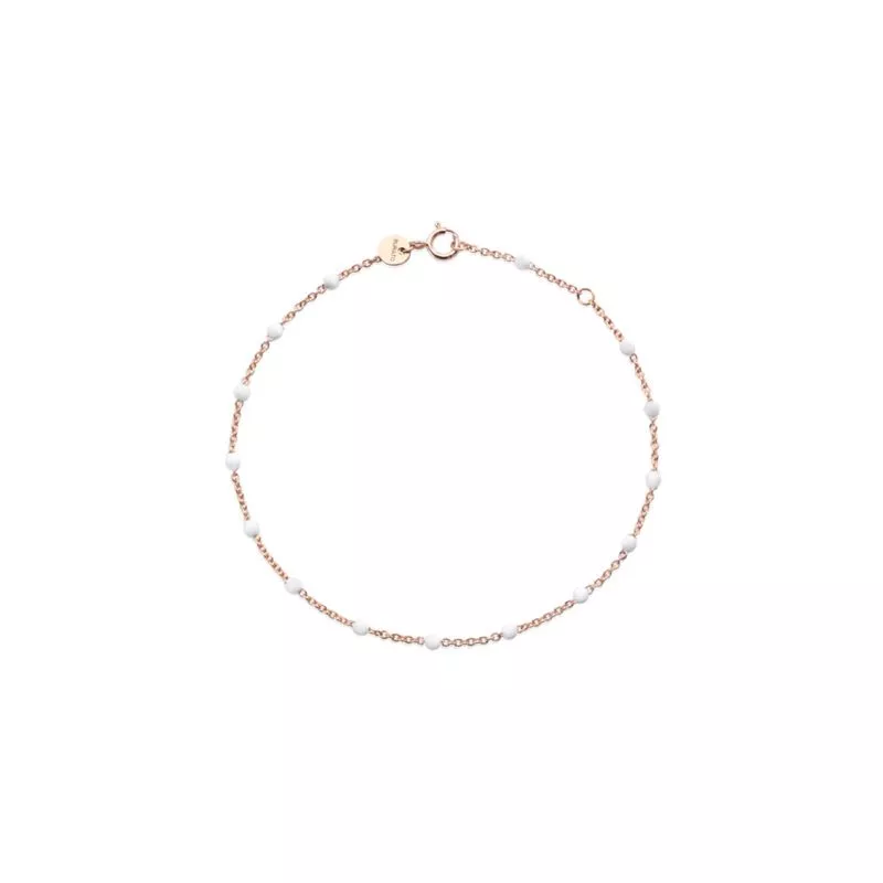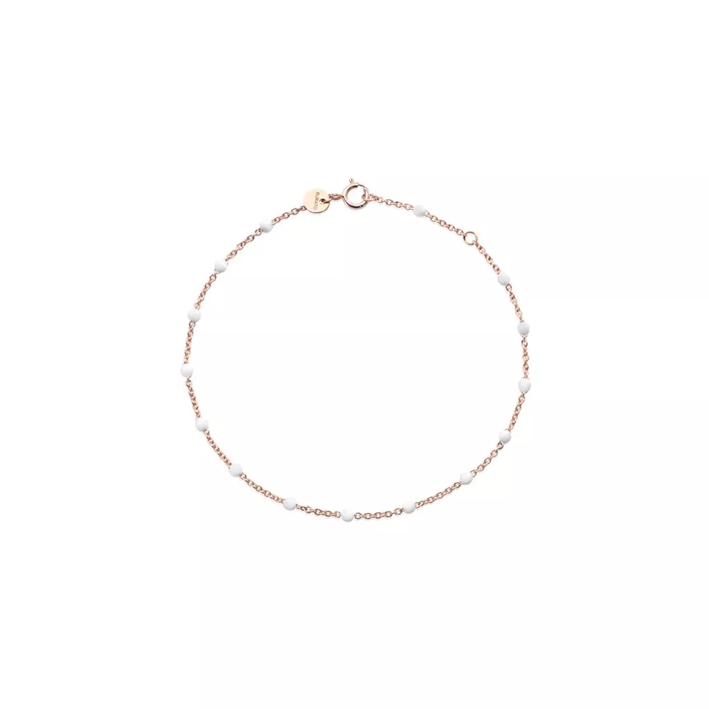 Il raffinato oro rosa 18 carati è abbinato alle candide tonalità delle piccole sfere di resina bianca.