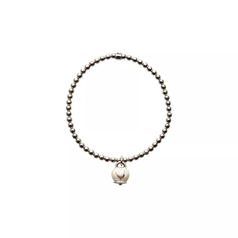 Questo bracciale elastico in argento è abbellito da un grazioso ciondolo Campanella micro ed è decorato dallo smalto bianco.