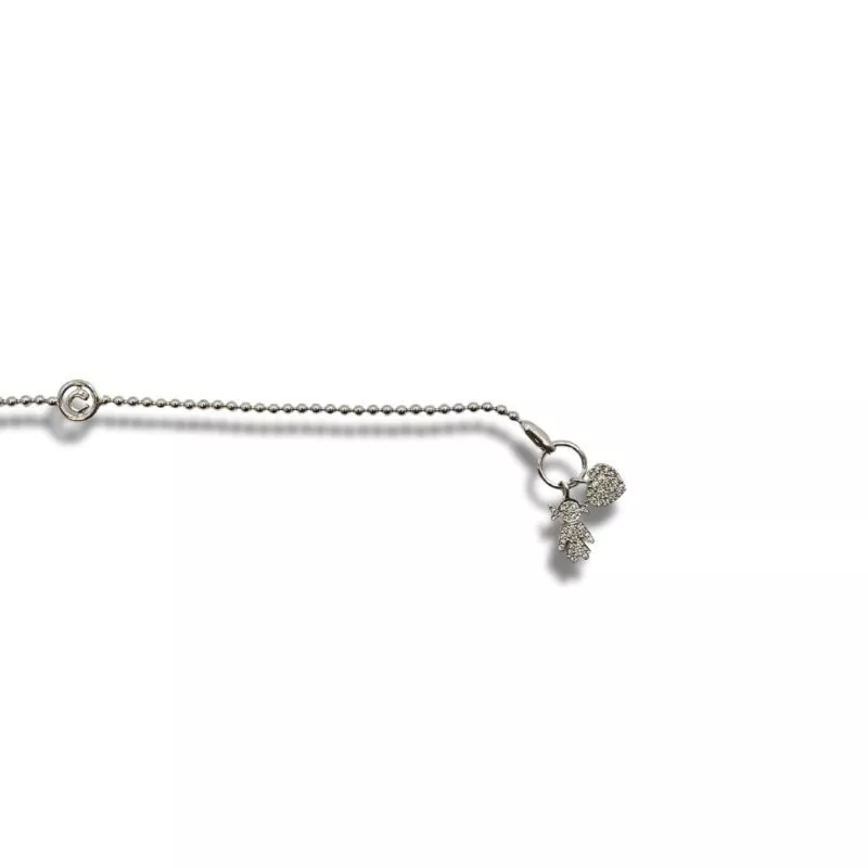 Il modello è realizzato in oro bianco e presenta un ciondolo bimba e uno cuore impreziositi da diamanti.