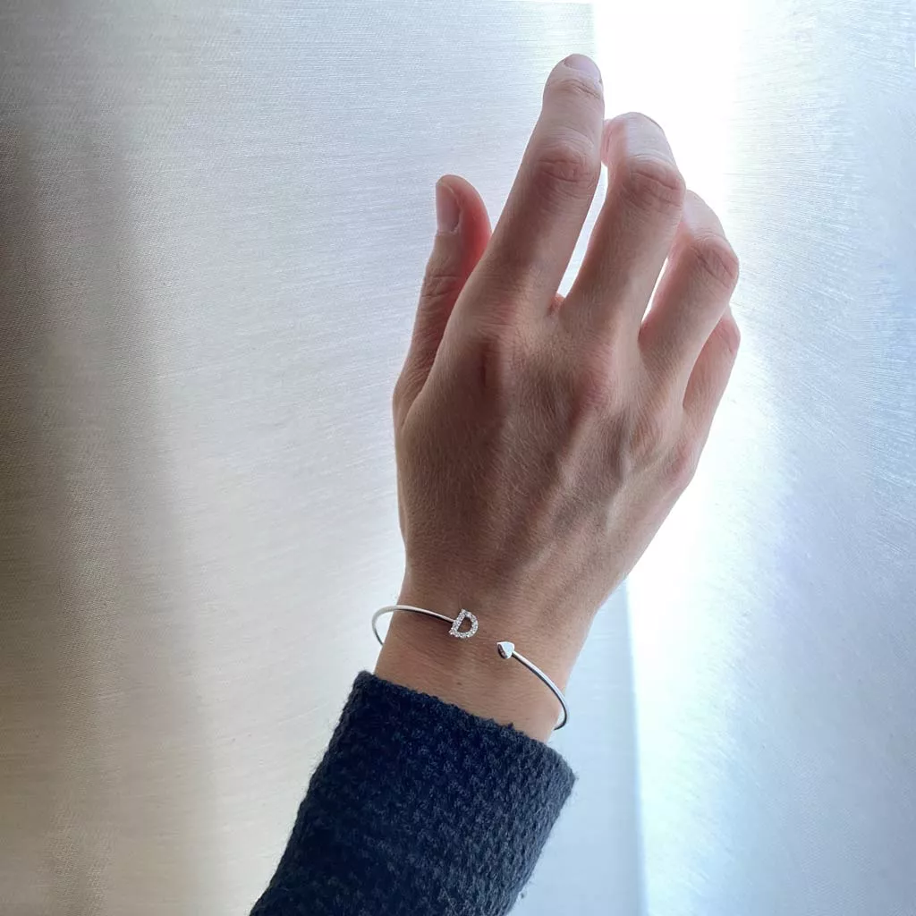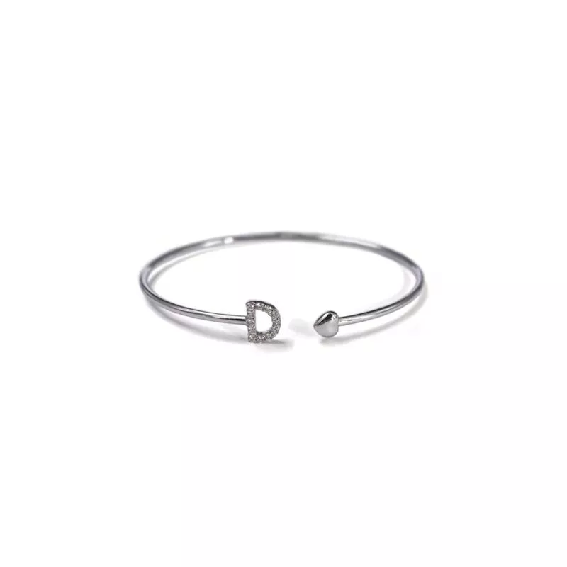 Questo bracciale rigido Crivelli è un modello luminoso e raffinato. Presenta una graziosa lettera “D” ed un cuore ad abbellirlo. L’abbinamento tra oro bianco e diamanti lo rende ancora più prezioso.