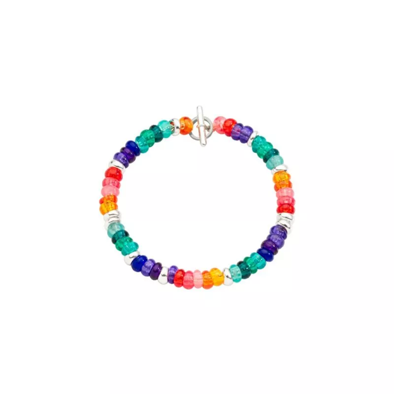Bracciale Dodo Rondelle Arcobaleno in argento 925 e plastica riciclata, catena e t-bar in argento 925, anello brisè in acciaio. Ago in argento 925 incluso.