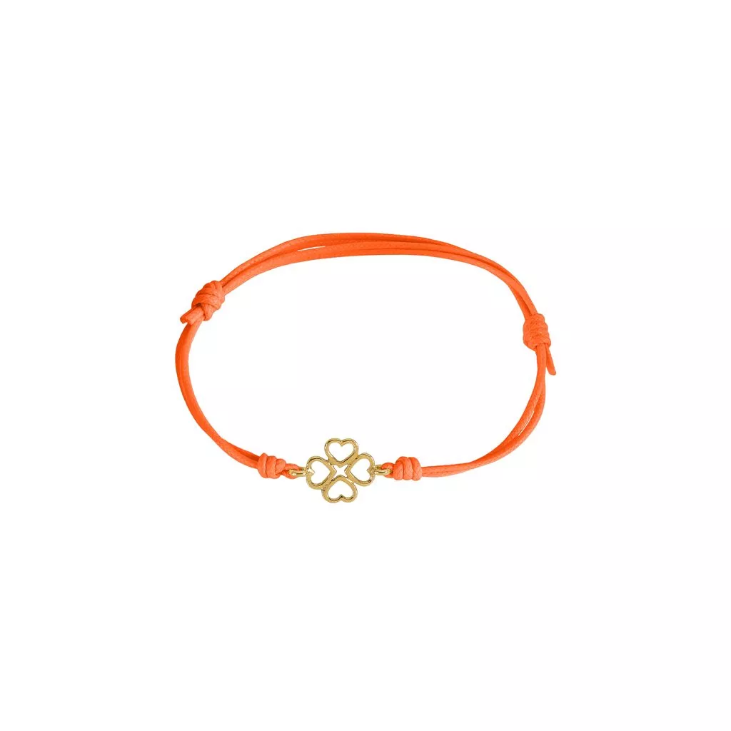 Bracciale Marco Gerbella con quadrifoglio. Disponibile in oro giallo e in oro rosa. Cordino disponibile in diversi colori.