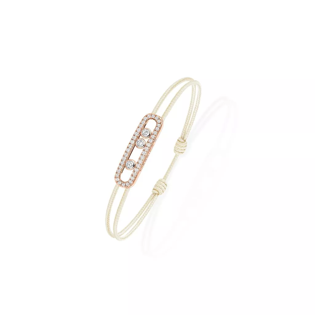 Il bracciale Messika Care(s) con cordino crema e tre diamanti mobili che spiccano sul motivo oro rosa, è un accessorio perfetto per uno stile casual-chic. Ad illuminarlo ulteriormente è presente un pavé di diamanti.