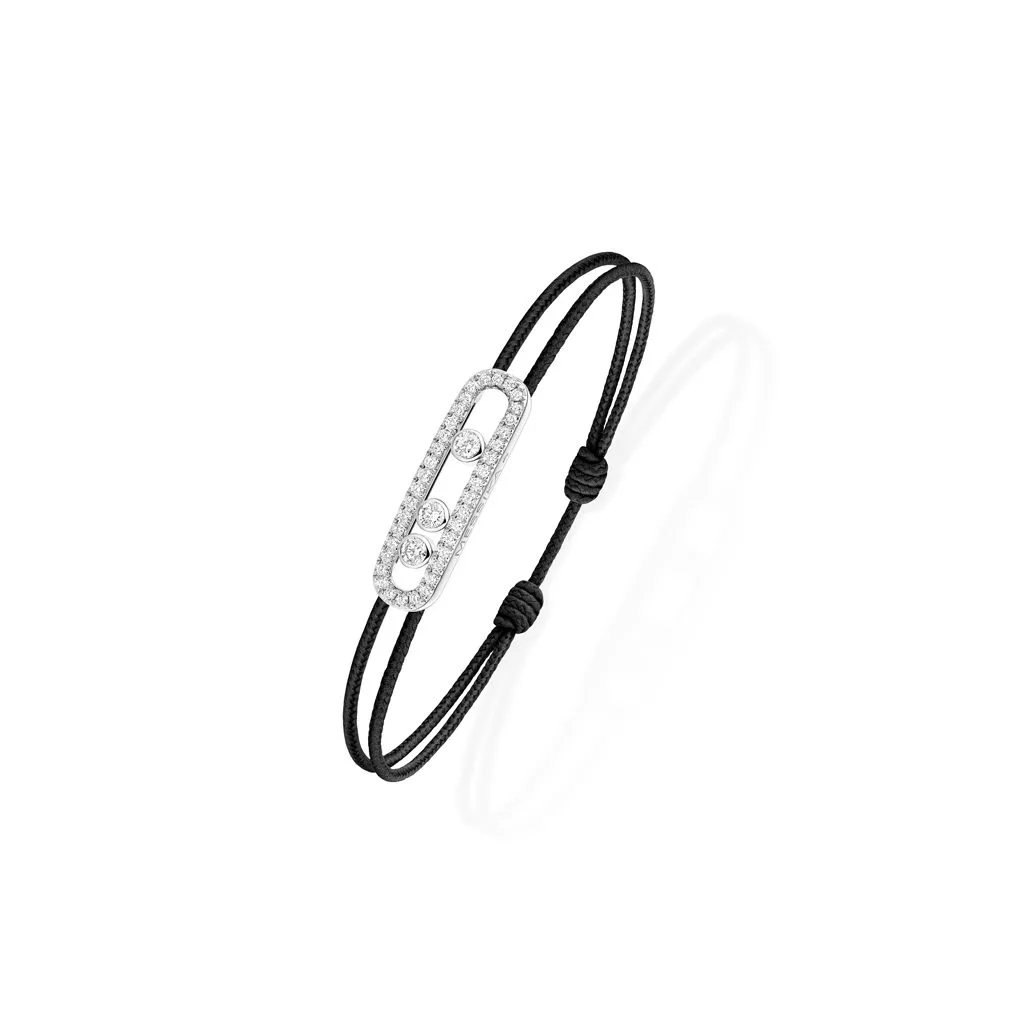 Il bracciale Messika Care(s) con cordino nero e tre diamanti mobili che spiccano sul motivo oro bianco, è un accessorio perfetto per uno stile casual-chic. Ad illuminarlo ulteriormente è presente un pavé di diamanti.