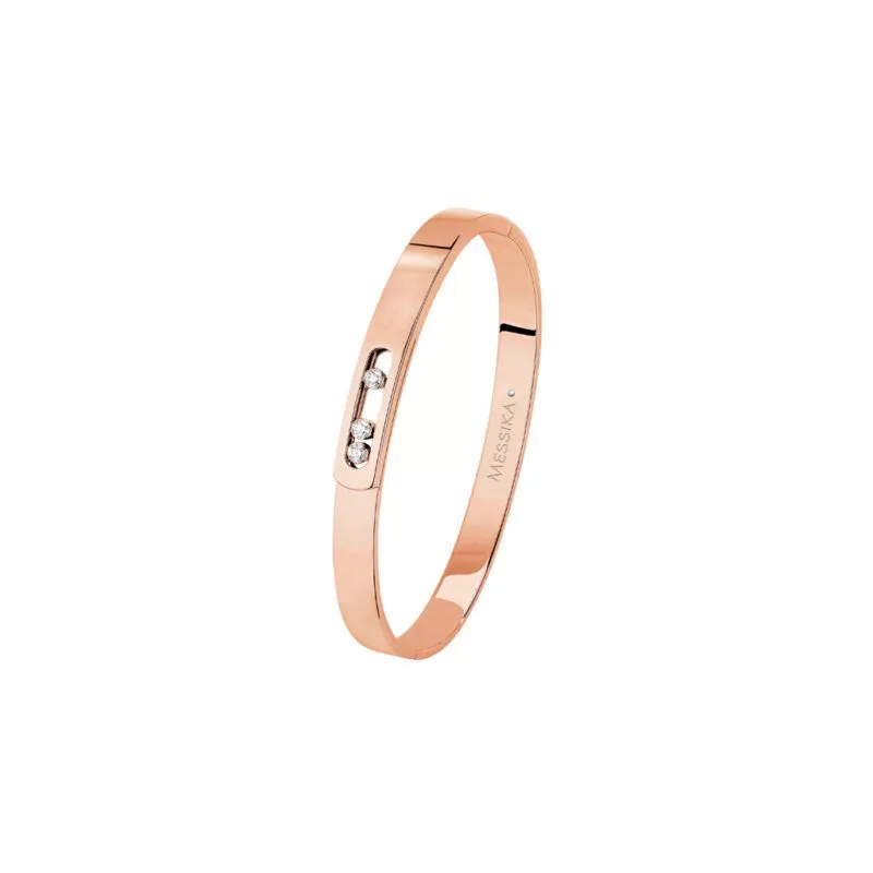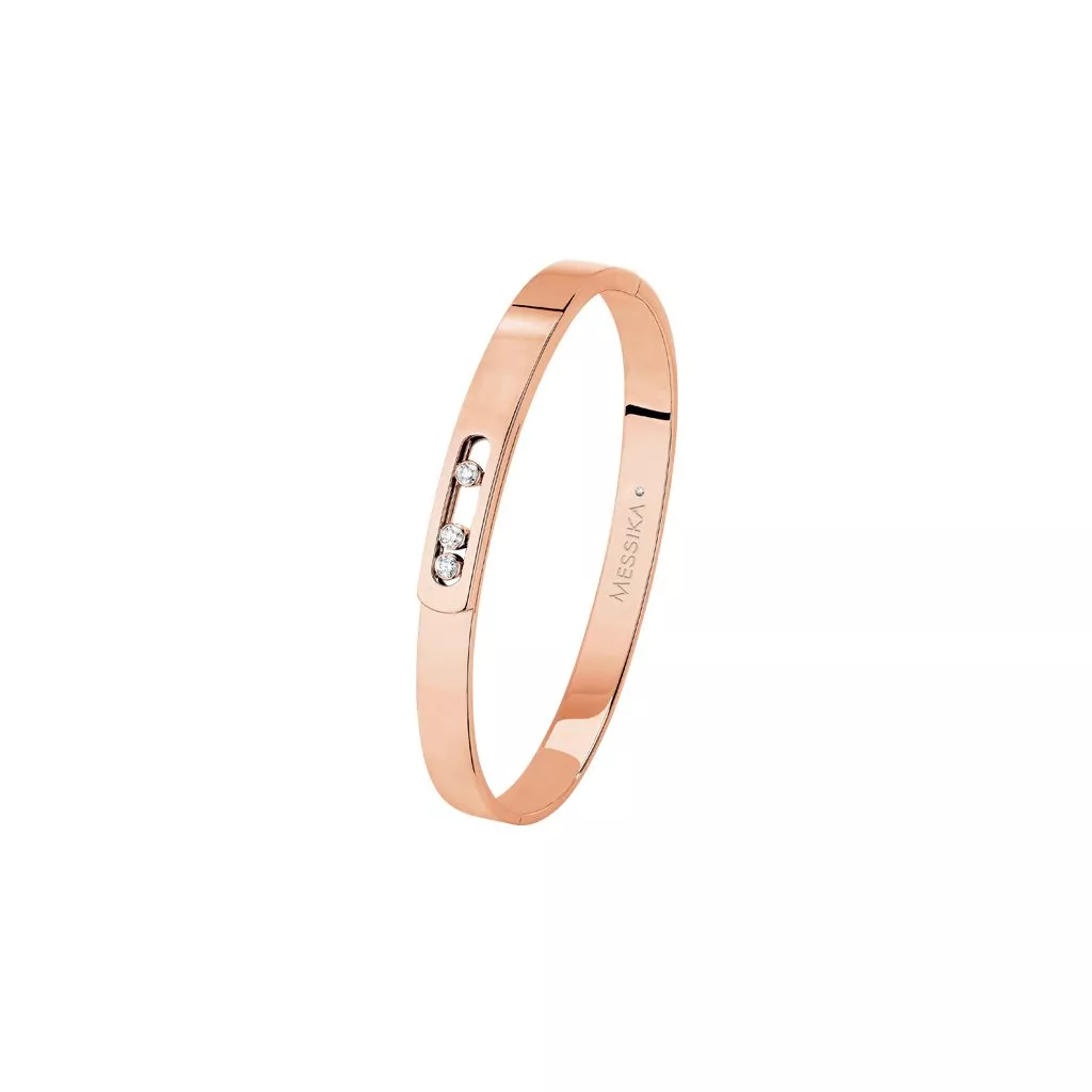 Questo bracciale in oro rosa 18 carati fa parte di Move, la collezione firmata della Maison Messika. Tre diamanti mobili lo illuminano ulteriormente.