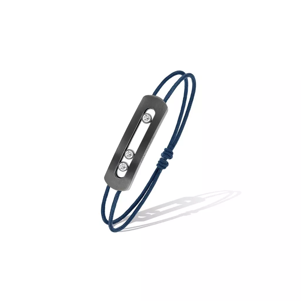 Bracciale da uomo della collezione Move Titanium di Messika in titanio grafite con diamanti e cordino blu.
