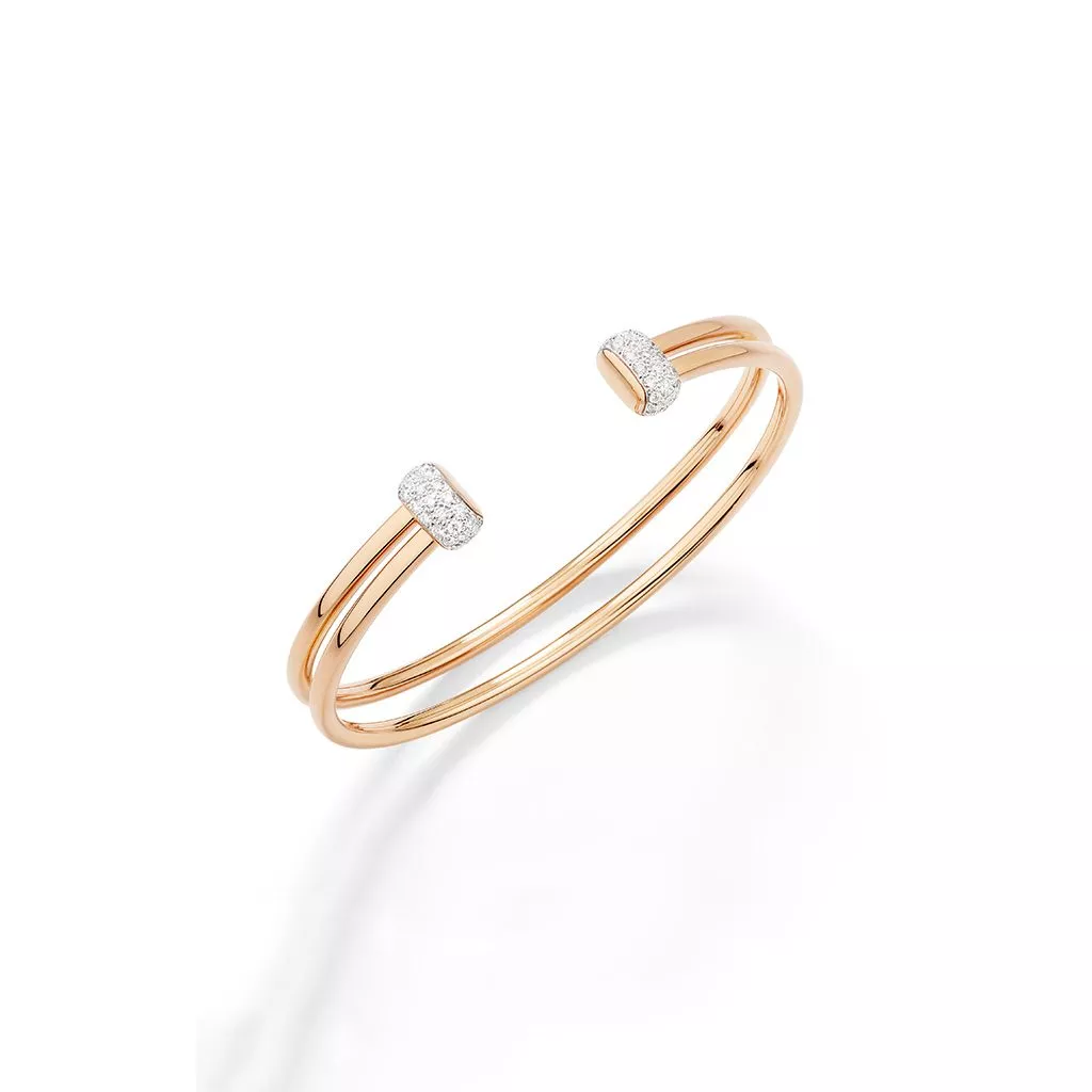 Bracciale Pomellato collezione Together rigido a doppia canna realizzato in oro rosa con diamanti bianchi.