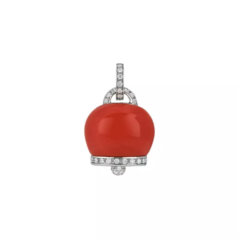 Ciondolo grande Campanella di Chantecler in oro bianco 18Kt, corallo rosso e diamanti bianchi.