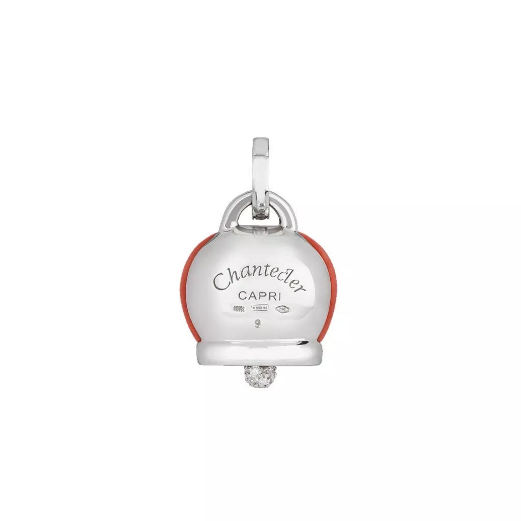 Questo ciondolo grande Campanella di Chantecler è realizzato in oro bianco 18Kt e corallo rosso. Dei brillanti diamanti bianchi lo illuminano.