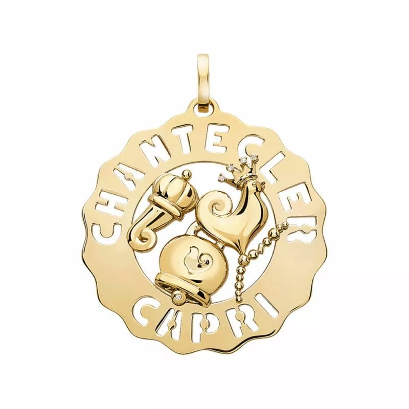 Ciondolo Chantecler Logo grande con Gallo, Campanella e Cornetto realizzato in oro giallo 18Kt e diamanti.