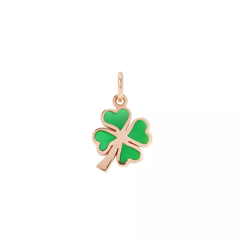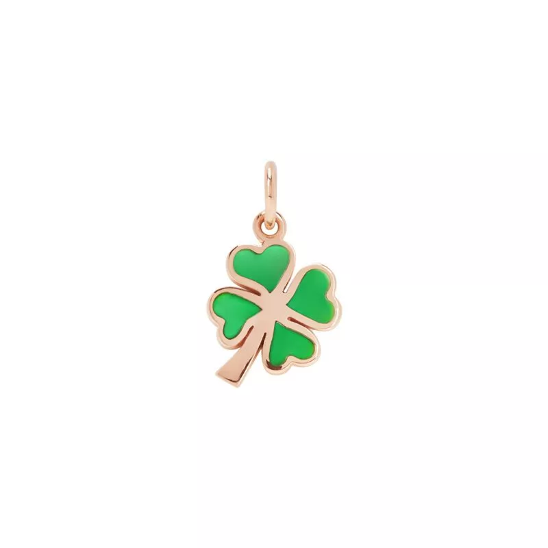 Questo ciondolo quadrifoglio di Dodo è realizzato in oro rosa 9K ed è decorato da un vivace smalto cattedrale verde. Cordino nero incluso.