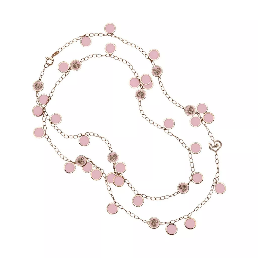 Collana Chantecler Paillettes realizzata in oro rosa e smalto rosa. Abbellita da diamanti bianchi. Lunghezza 90 cm.