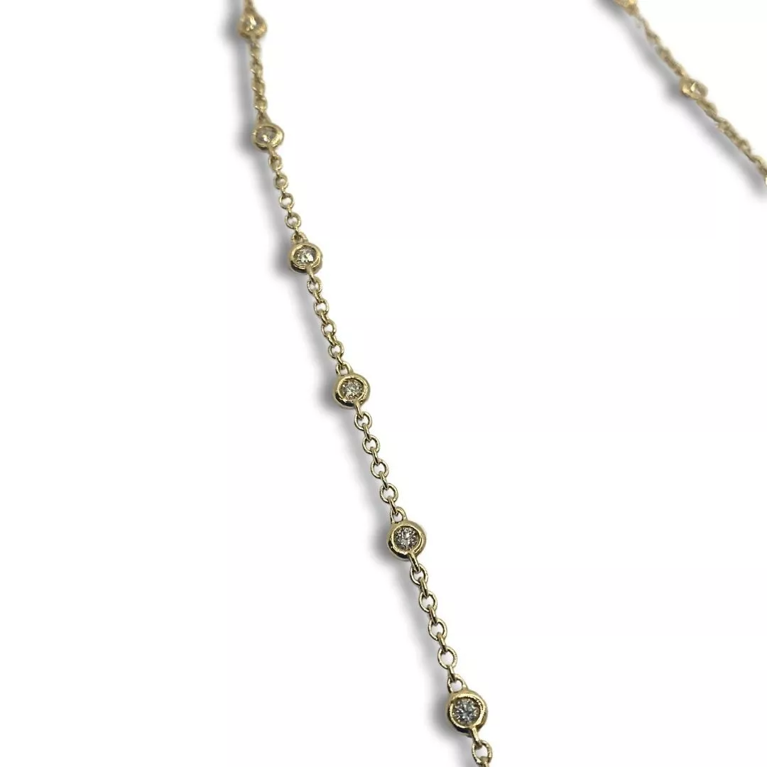 Il modello é realizzato in oro giallo e presenta diamanti incastonati sulla catena leggera.