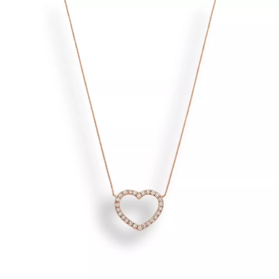 Questa collana è realizzata in oro rosa e presenta un cuore in oro con diamanti.