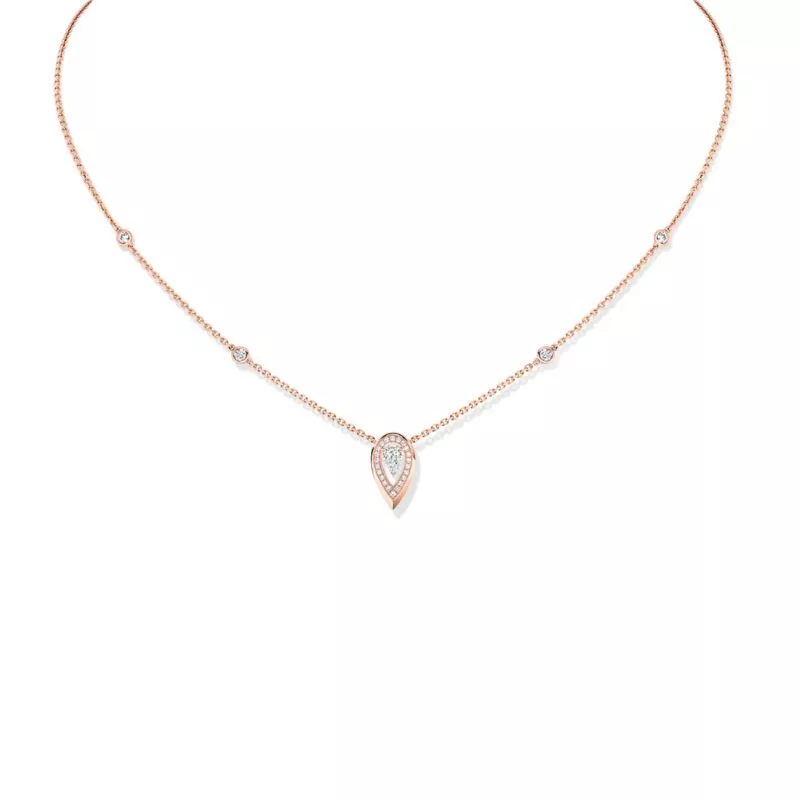 Collana Messika Fiery 0,10 ct in realizzata in oro rosa. Abbellita da brillanti diamanti bianchi e un diamante taglio a pera centrale.