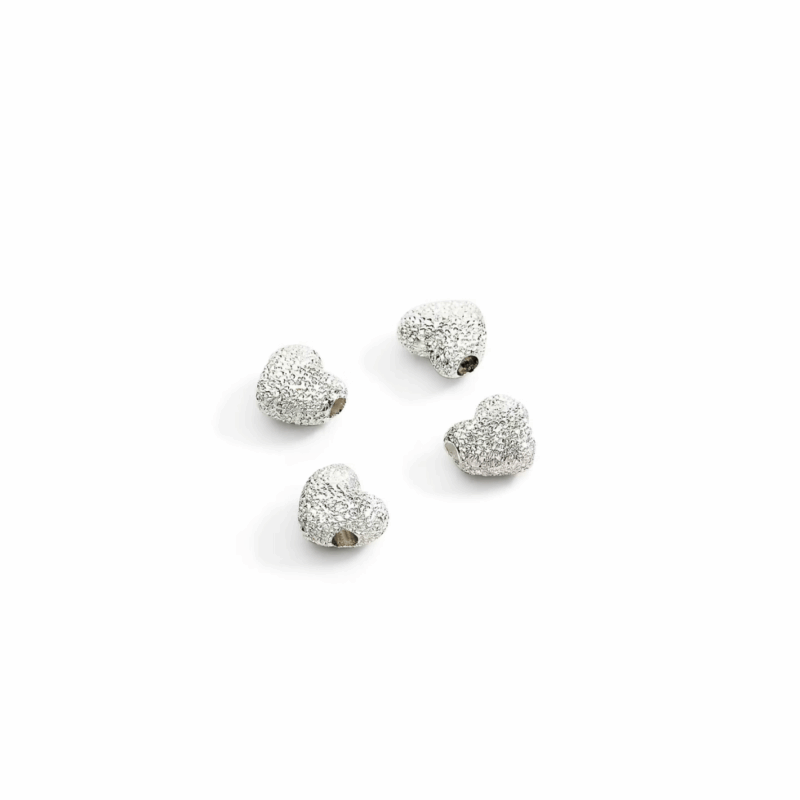Quattro cuori in argento sterling con finitura diamond‑cut realizzata a mano. Creati in protofusione e microfusione a cera persa, sono svuotati per risultare leggeri, induriti per stabilizzarne la forma e placcati in argento per una lucentezza uniforme.