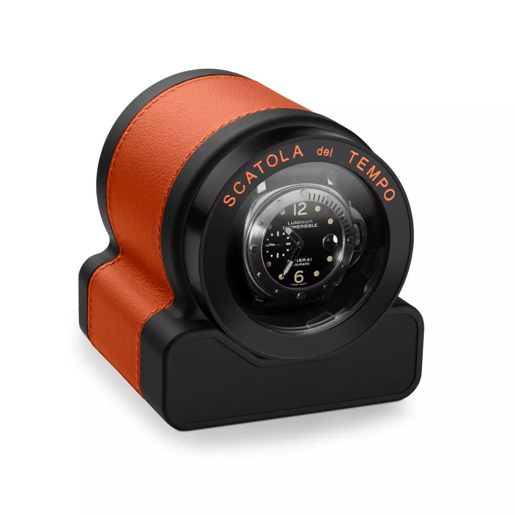 Custodia per orologi in pelle di mucca arancione. Coperchio esterno con finitura soft touch e scritta arancione. Alimentazione a 2 batterie e autonomia di 3 anni.