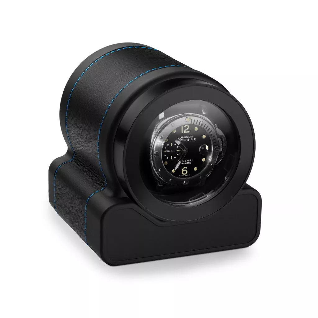 Custodia per orologi in pelle di mucca, nera con impunture blu. Coperchio esterno con finitura soft touch. Alimentazione a 2 batterie e autonomia di 3 anni.
