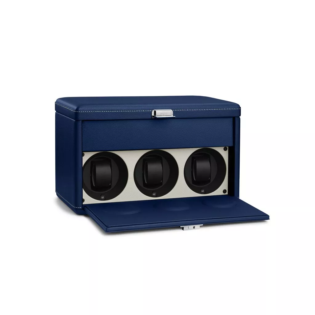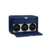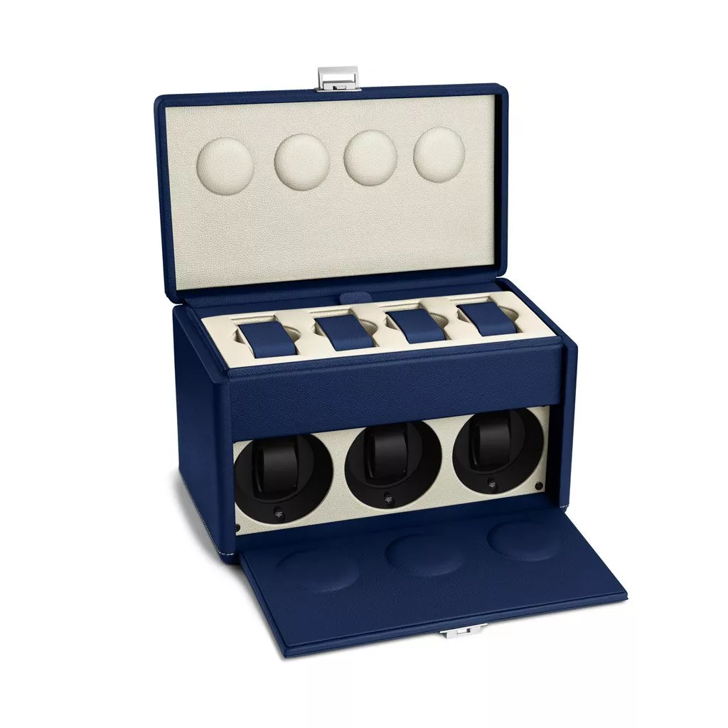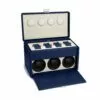 Custodia per orologi in pelle di vitello blu e bianco sporco. 3 caricatori programmabili e spazio per riporre 4 orologi. Alimentazione a 6 batterie, con vita media di 3 anni.