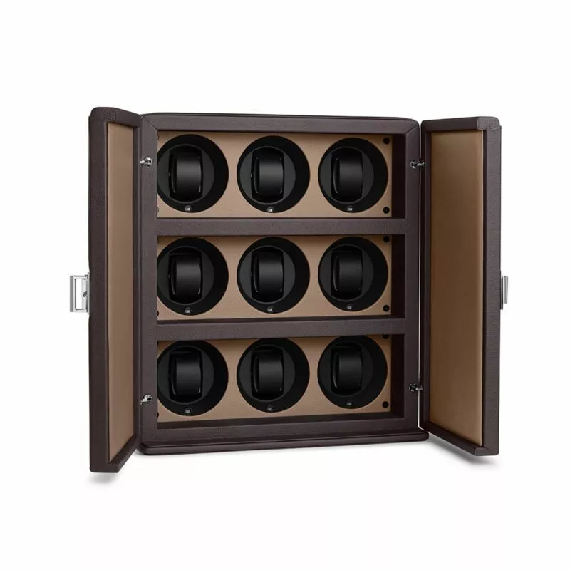 Questo modello di Scatola del Tempo è rivestito interamente in pelle di vitello e presenta una chiusura color argento. Permette di mantenere in carica fino a 9 orologi di grandi dimensioni.