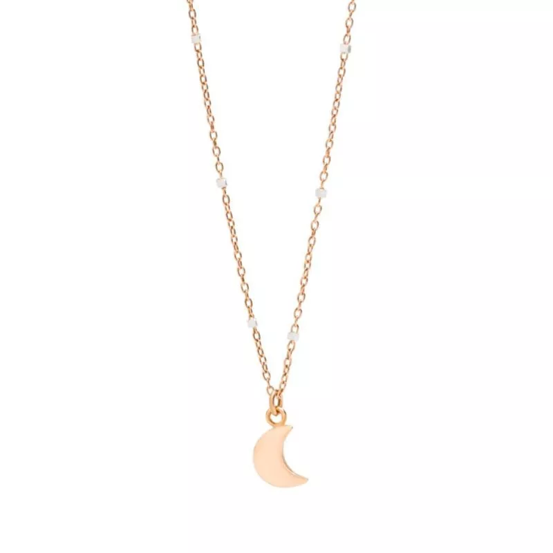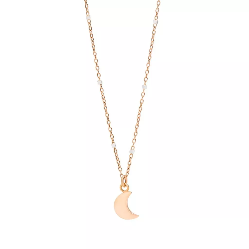 Collana in oro rosa 9 kt ed oro bianco rodiato 9 kt con ciondolo luna modello mini, chiusura a moschettone.