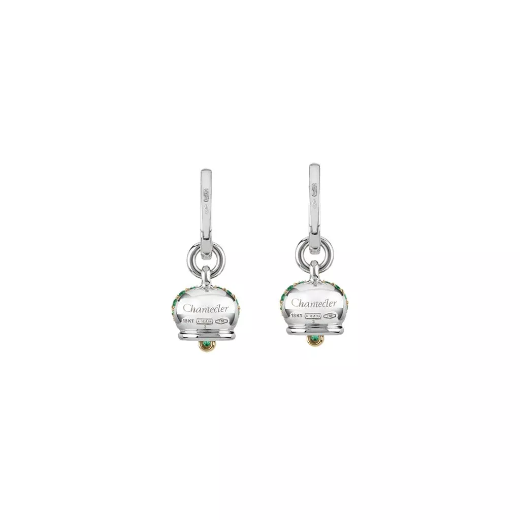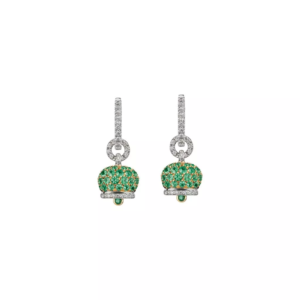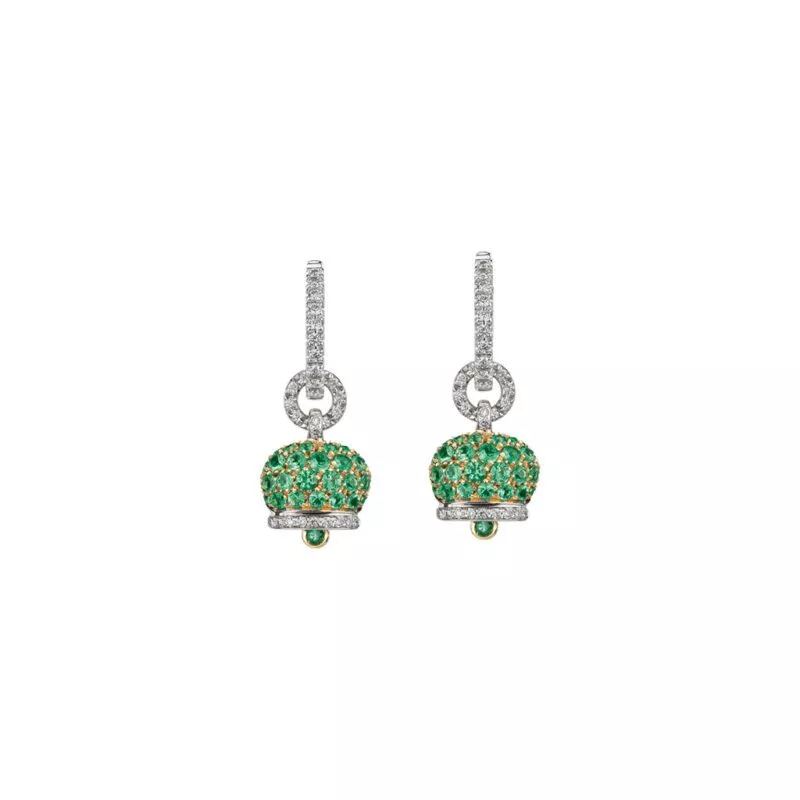 Orecchini Chantecler Campanella piccola in oro giallo e oro bianco 18Kt con diamanti bianchi e pavé di smeraldi.