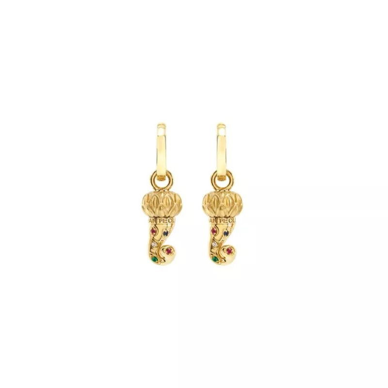 Gli orecchini Corno piccoli sono realizzati in oro giallo 9Kt e presentano diamanti, zaffiri, smeraldi e rubini.