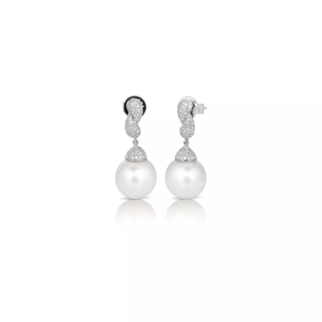 Questi orecchini della collezione CLASSICA sono realizzati in oro bianco 18kt e presentano perle australiane da 12,5mm e diamanti 0,98ct.