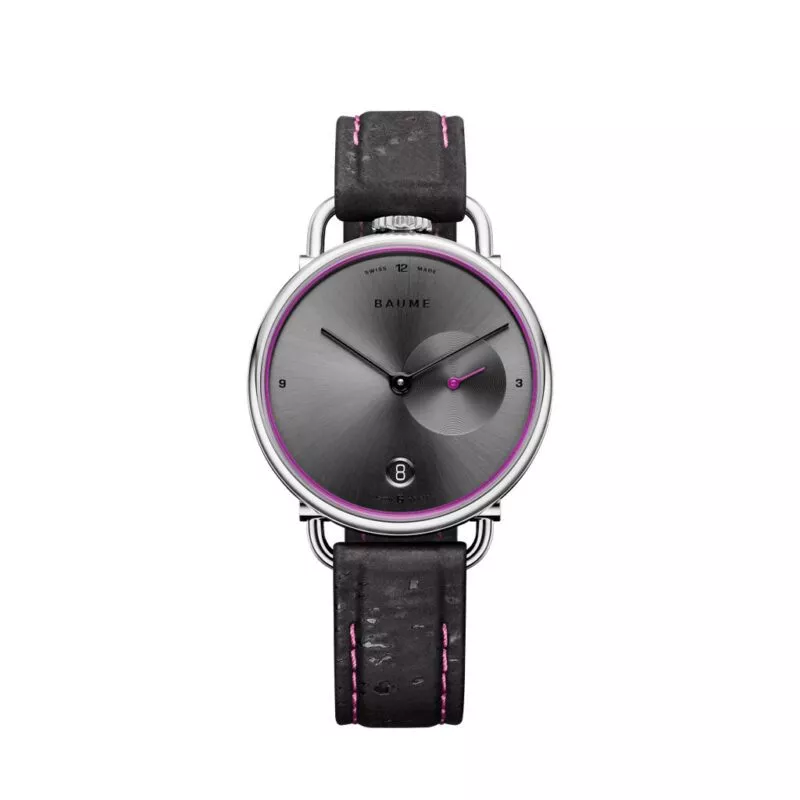 La collezione Baume propone réhaut colorati che richiamano il colore della lancetta dei piccoli secondi e delle impunture proposte sul cinturino. Tutti i cinturini sono in materiali naturali ed intercambiabili grazie al sistema di pulsanti riciclati.