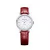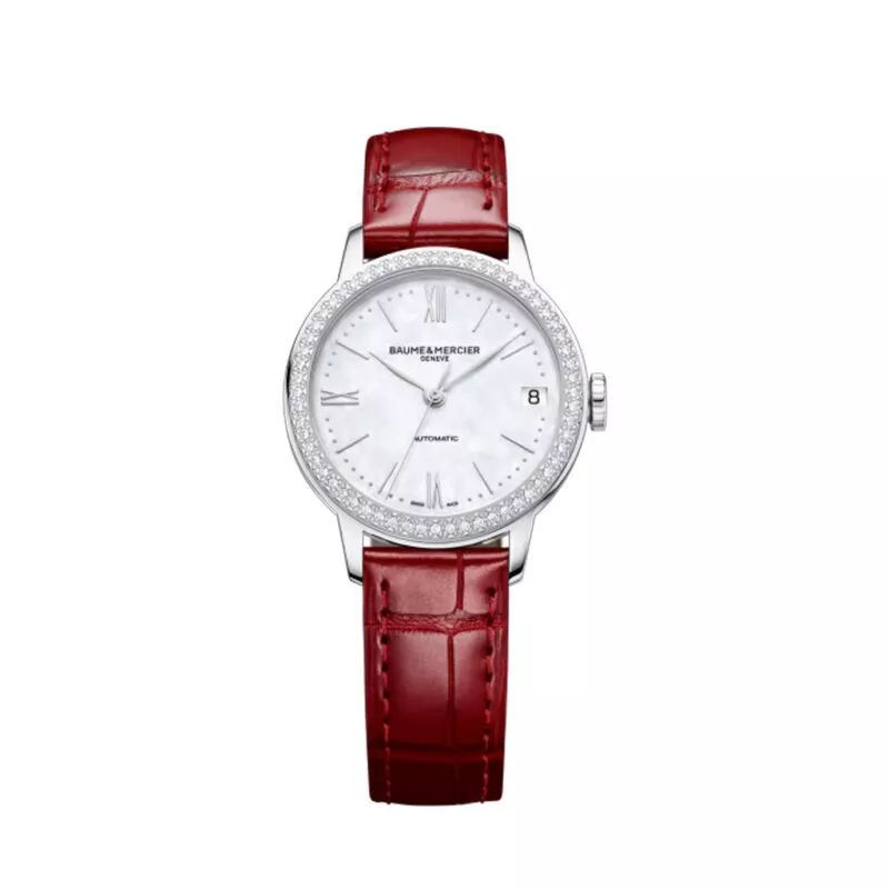 Orologio Baume & Mercier Classima Lady 10546. Cassa da 31 mm in acciaio. Diamanti. Quadrante in madreperla bianca. Cinturino rosso in alligatore.