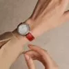 Il cinturino rosso brillante in pelle di alligatore è chiuso da una classica fibbia ad ardiglione.