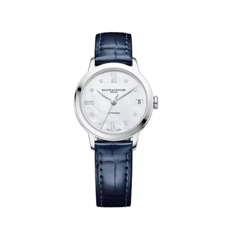 Orologio da 31 mm di diametro, con movimento automatico Swiss Made. Cassa in acciaio e cinturino in alligatore blu. Quadrante madreperla, impreziosito da diamanti e numeri romani. Protetto da vetro zaffiro ed impermeabile fino a circa 50 metri.