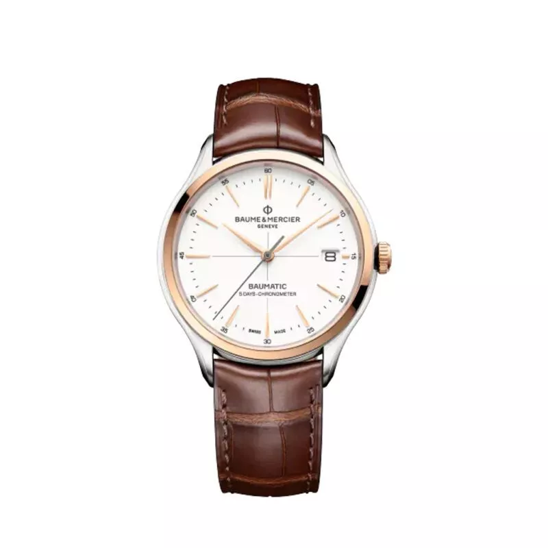 Orologio Baume & Mercier Clifton con cassa da 40 mm. Quadrante bianco. Cinturino marrone in pelle di alligatore. Movimento a carica automatica Baumatic.