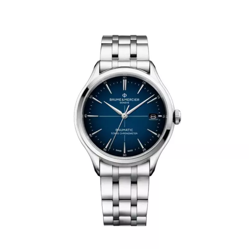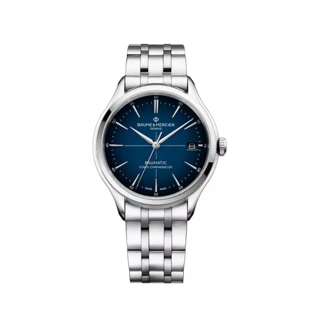 Orologio con movimento automatico, Baumatic e impermeabilità fino a circa 5 ATM. Cassa da 40 mm in acciaio, come anche il bracciale. Quadrante blu sfumato, disponibile anche in altre colorazioni. Fondello in vetro zaffiro.