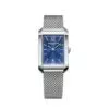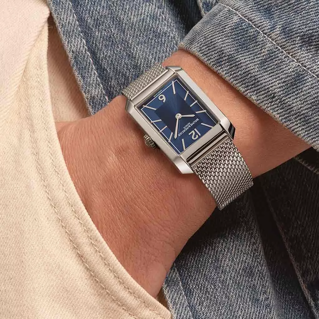 La cassa rettangolare da 43 x 27,5 mm è in acciaio. È protetta dal vetro zaffiro bombato. Il quadrante è satinato soleil blu. I numeri e gli indici rivettati placcati al rodio sono elegantemente indicati da lancette a gladio.