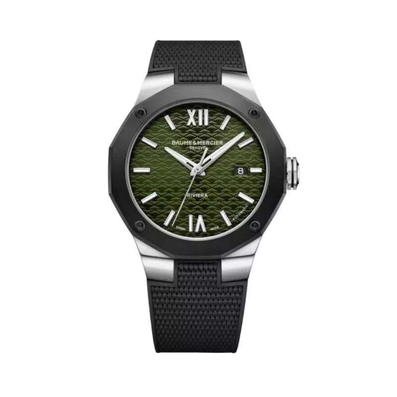 Orologio Baume & Mercier Riviera 10763 con movimento automatico, cassa in acciaio da 42 mm e cinturino in caucciù nero.