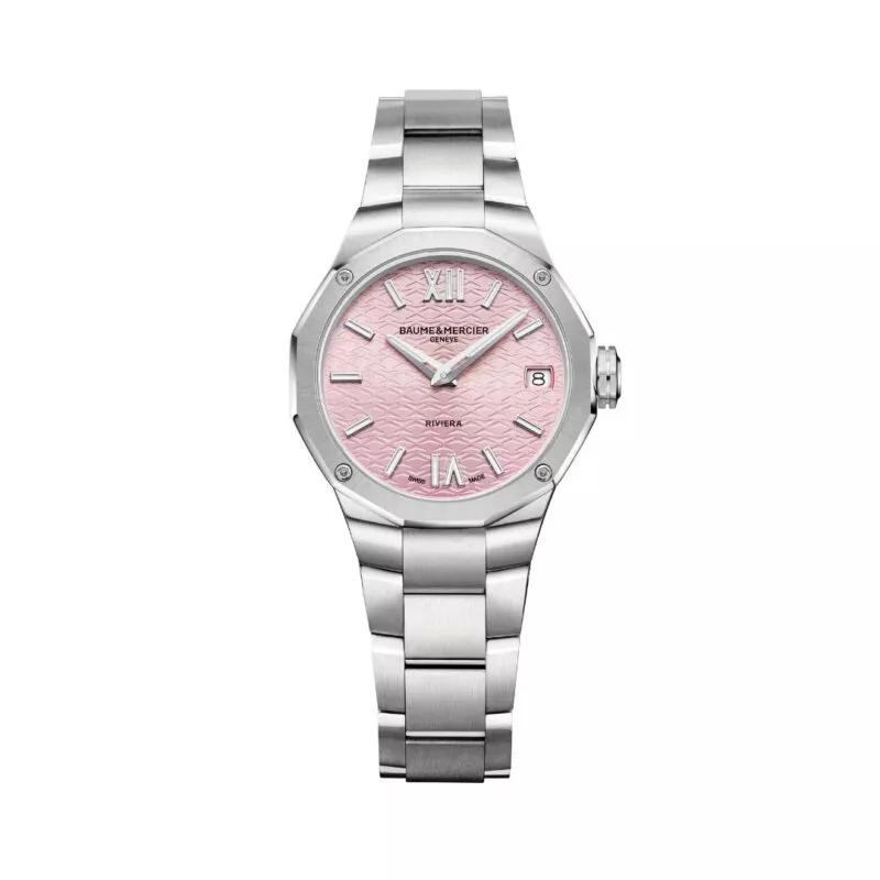 Orologio Baume & Mercier Riviera 10812 con quadrante rosa satinato soleil, cassa in acciaio da 33mm e bracciale in acciaio.
