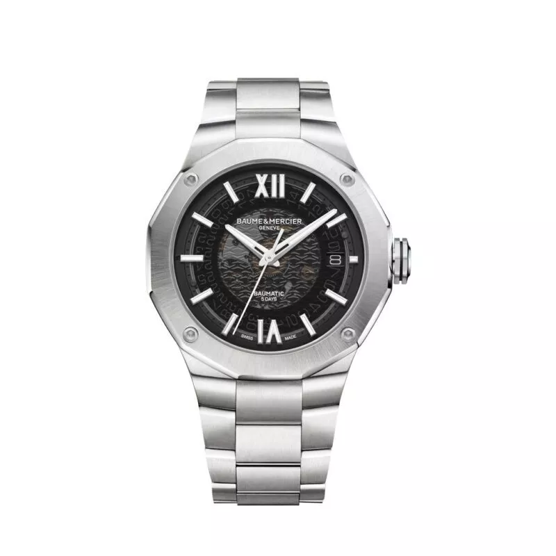 Orologio Baume & Mercier Riviera con cassa da 42 mm. Quadrante in vetro zaffiro grigio fumé. Movimento a carica automatica, Baumatic.