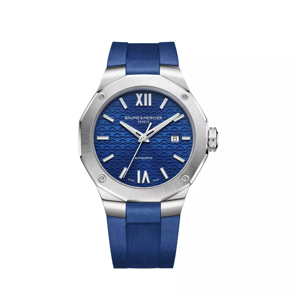Orologio Baume & Mercier Riviera con cassa in acciaio da 42 mm. Quadrante blu. Cinturino in caucciù blu. Movimento automatico.