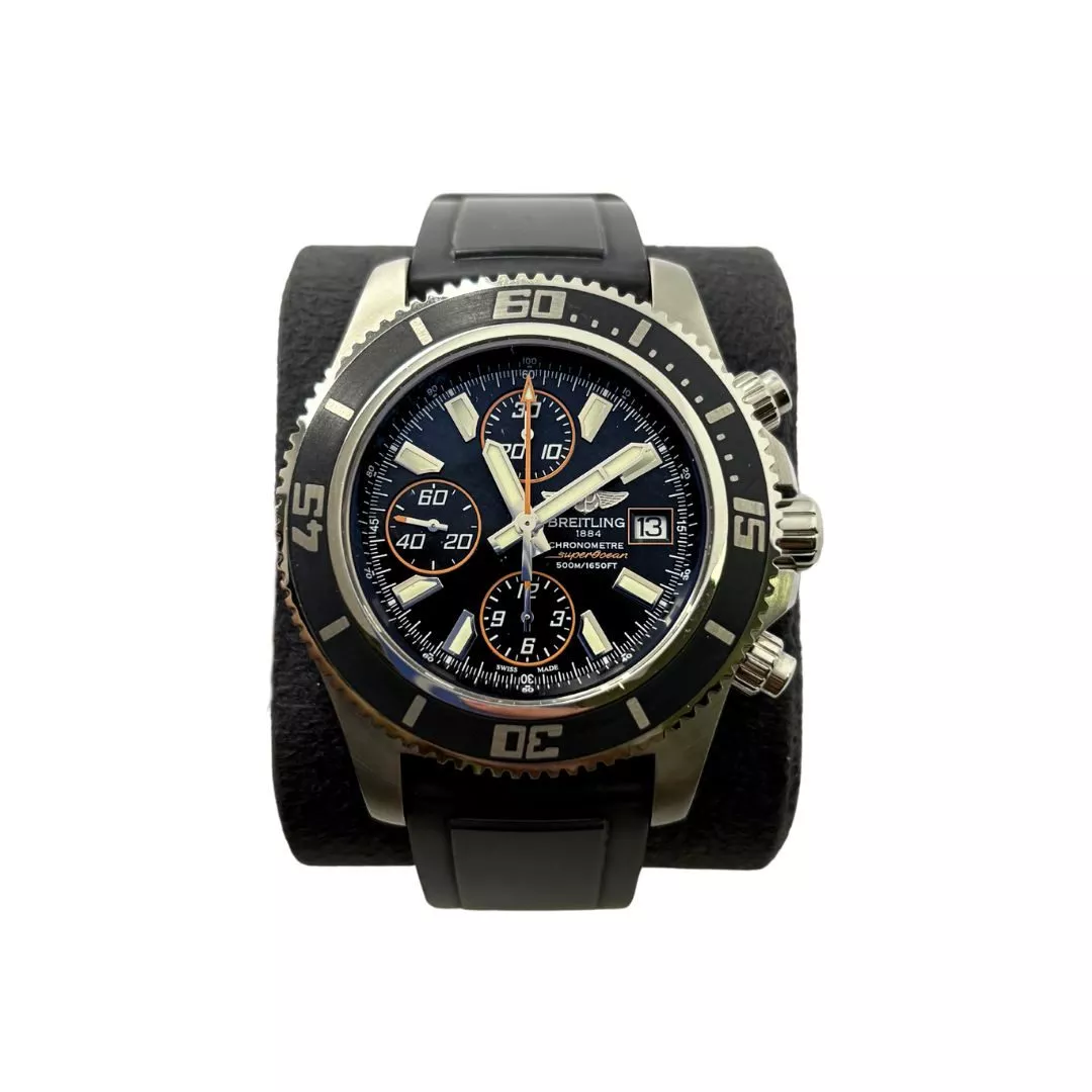 Orologio Breitling Superocean con cassa da 44 mm e quadrante nero con dettagli arancioni. Cinturino in caucciù nero.