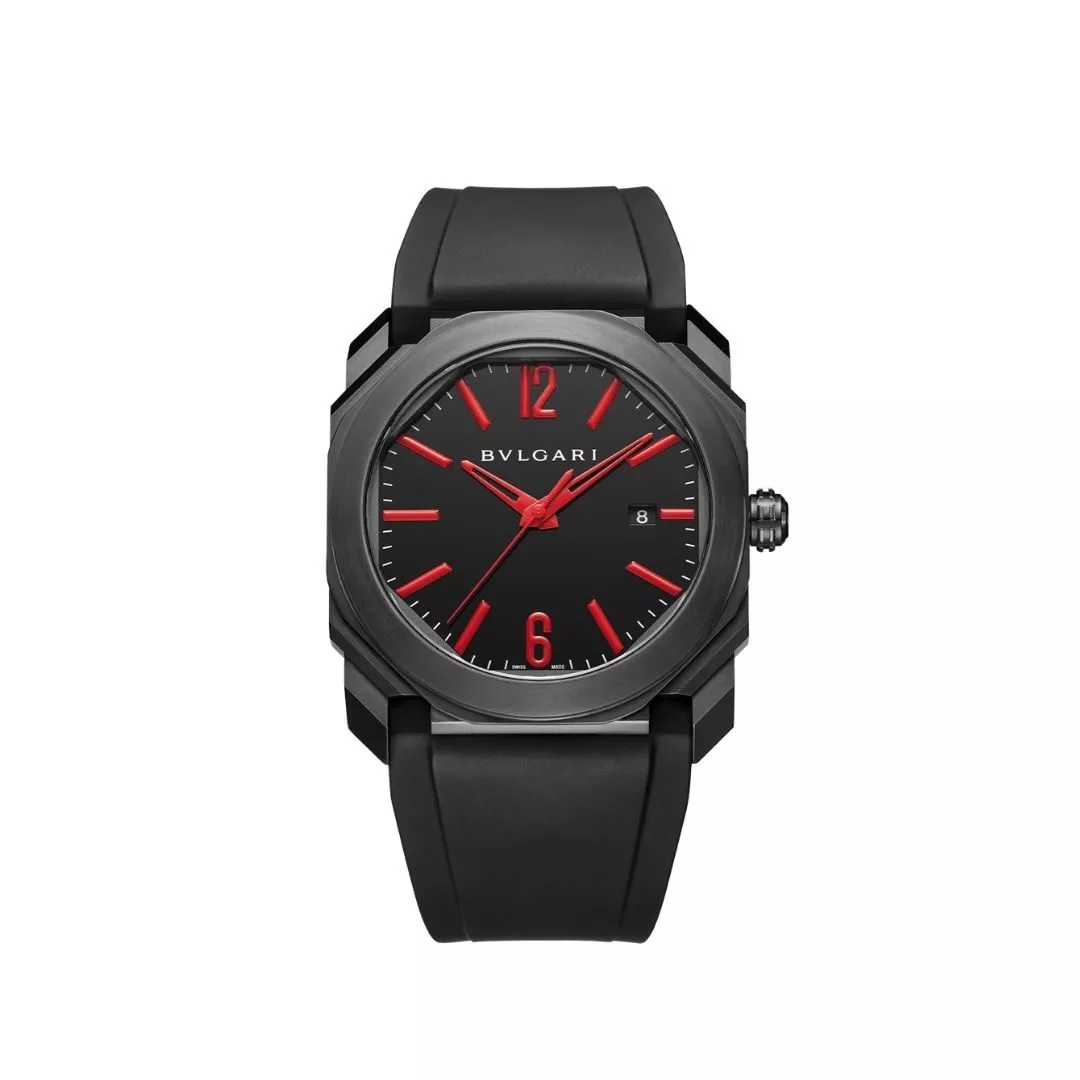 Orologio Bvlgari Octo Ultranero a carica automatica con datario. Cassa di 41 mm in acciaio con rivestimento DLC. Cinturino in caucciù nero.